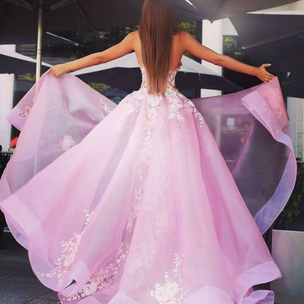 New A-Line Sweetheart Sweep Train Pink Tulle Prom Dresses with Lace Appliques OK901